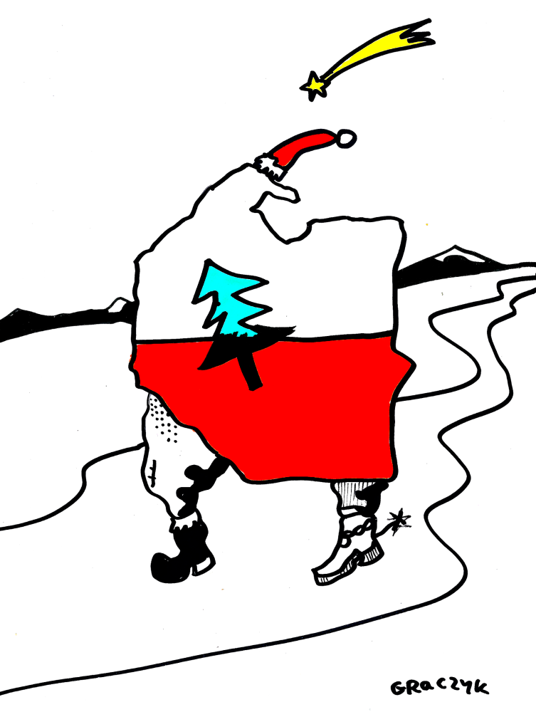 Wystawa Święta, Święta i po… godne żartowanie związana jest z magią świąt, prezentami i czasem przełomu. To druga w tym cyklu prezentacja zbiorowa. Pięciu renomowanych rysowników, w tym świetna czwórca satyryczna znana już bielskiej publiczności: Bartłomiej Belniak z Gorlic, Michał Graczyk z Nysy, Sławomir Łuczyński z Pabianic (prezentujący tym razem jedną jedyną, jakże ikoniczną pracę w wymiarze 100x70), Marek Mosor Widget z Tarnowa (ex B-B) oraz – premierowo w naszych progach – Zbigniew Piszczako z Olsztyna nadając prześmiewczą formę trafnym obserwacjom absurdalnych sytuacji przydarzających się nam wszystkim podczas przedświątecznej bieganiny, albo w czasie biesiad przy świątecznym stole skutecznie wciągną widza w symboliczną grę pomiędzy światem mitologizujących oczekiwań a rzeczywistością groteskowych skojarzeń.